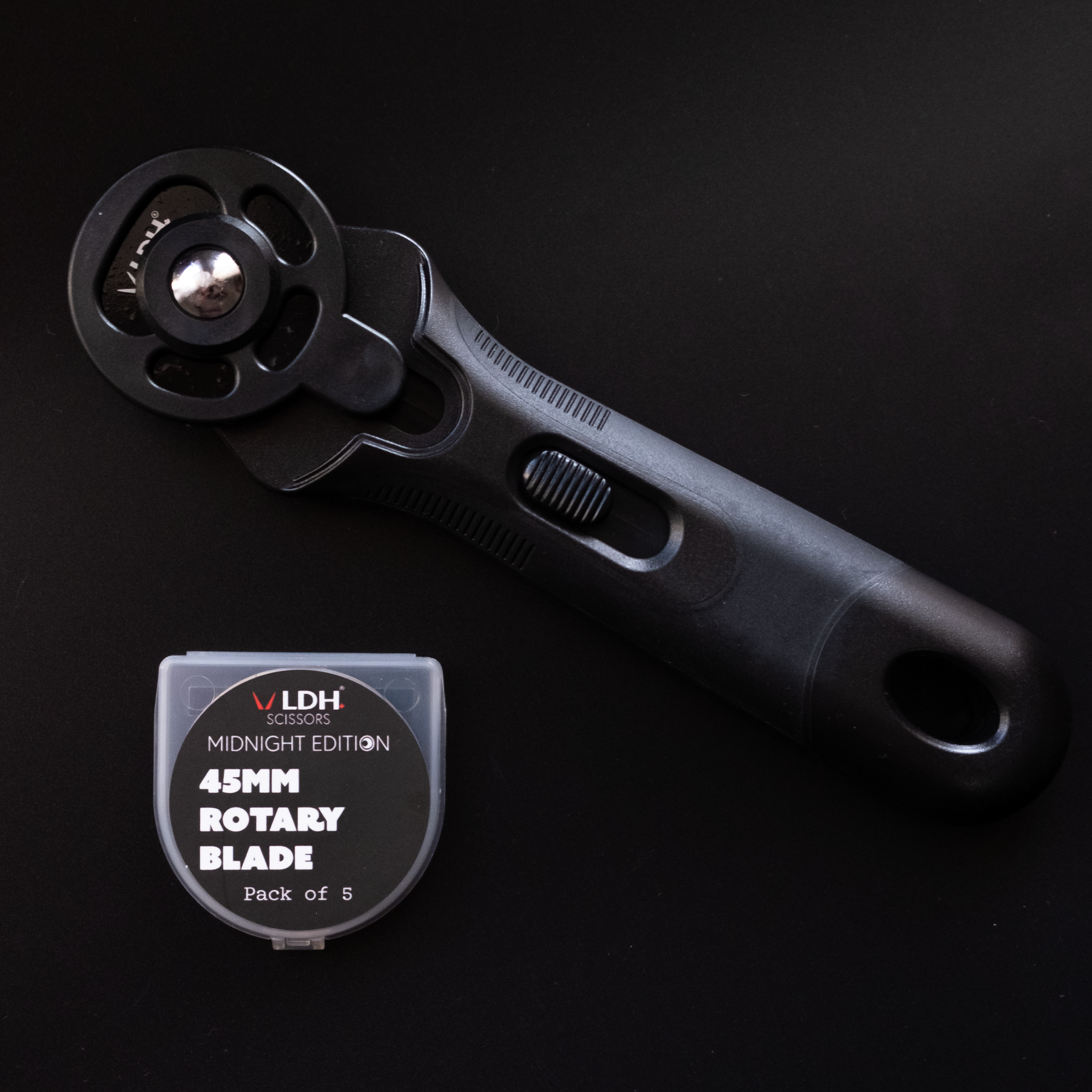 • 45mm Midnight Edition Rotary Cutter – Delivers smooth, clean cuts through fabric, leather, fleece, or vinyl. This cutter is ambidextrous and can be used in either the right or left hand.